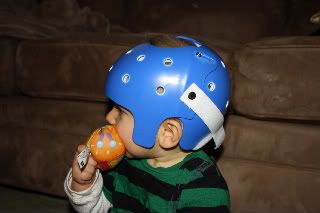 And now for our good news! Sam got his helmet today! He did wonderful when the helmet was first put on him, smiling the entire time. When our orthotist brought the helmet back in after specializing it, he put it back on a sleeping Sam man who never woke up the entire time. Surprisingly, Sam doesn't mind it a bit!